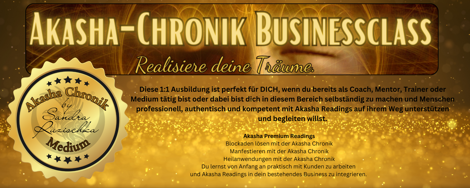 - In insgesamt acht 1:1 Ausbildungsterminen per Zoom von jeweils 120 Minuten lernst du, wie du Zugang zur Akasha Chronik für dich und deine Kunden erhältst.